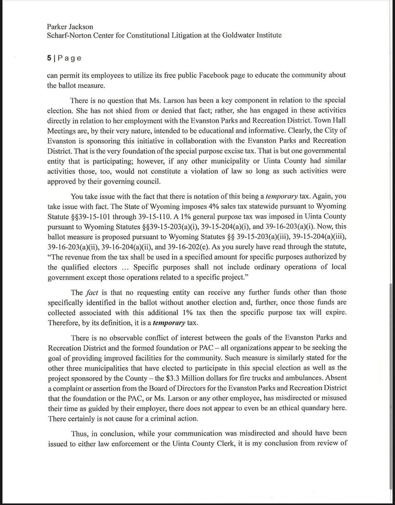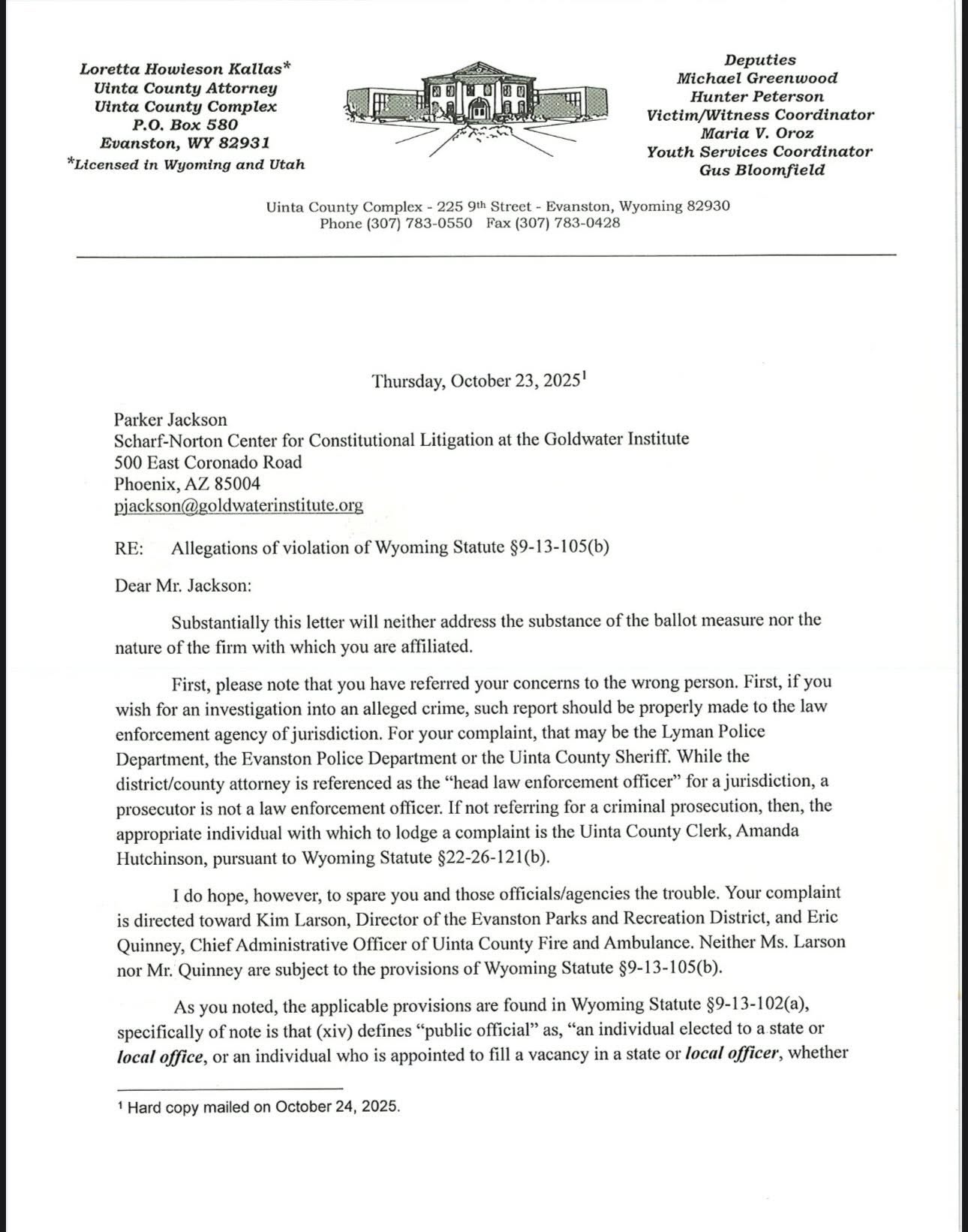 The Uinta County Attorney’s Office has responded to the Goldwater Institute’s request for an investigation into alleged misuse of public resources during the campaign for the 1% special purpose excise tax on the November 4 ballot.