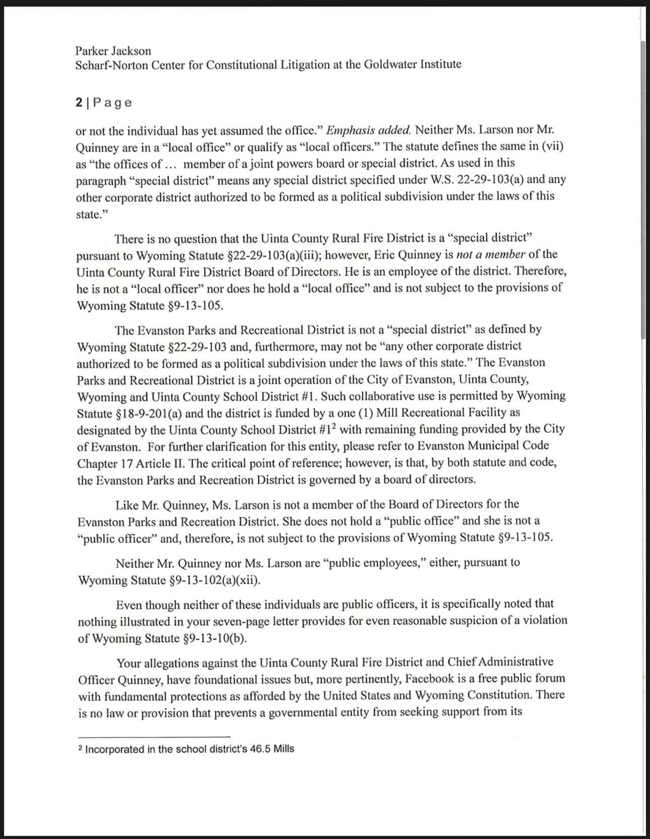 - 🧑⚖️ No statutory violation found: The response explains that neither Kim Larson, Director of the Evanston Parks and Recreation District, nor Eric Quinney, Chief Administrative Officer of Uinta County Fire and Ambulance, qualify as “local officers” or “public officials” under Wyoming Statute §9-13-102(a).